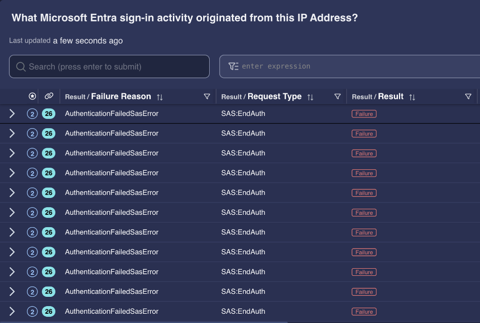 No matter where you start the investigation, Command Zero’s curated content allows an analyst to start from any point of reference and work from there. Analysts can ask pre-built questions on Command Zero to interrogate various systems and get to answers quickly. These answers can be executed for broad date/time ranges for discovery, or for short date/time ranges to identify specific patterns. In this blog post, we will cover four potential paths analysts can use to identify Midnight Blizzard, or any similar password spray attack in their environments.