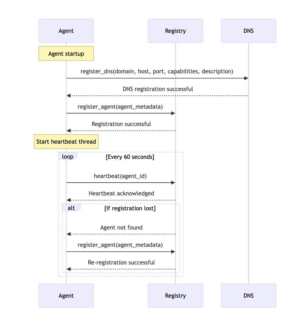 After registration, the agent maintains a heartbeat connection with the registry, sending periodic updates to confirm it's still active. If the registry loses track of the agent, the agent will automatically re-register during its next heartbeat attempt.