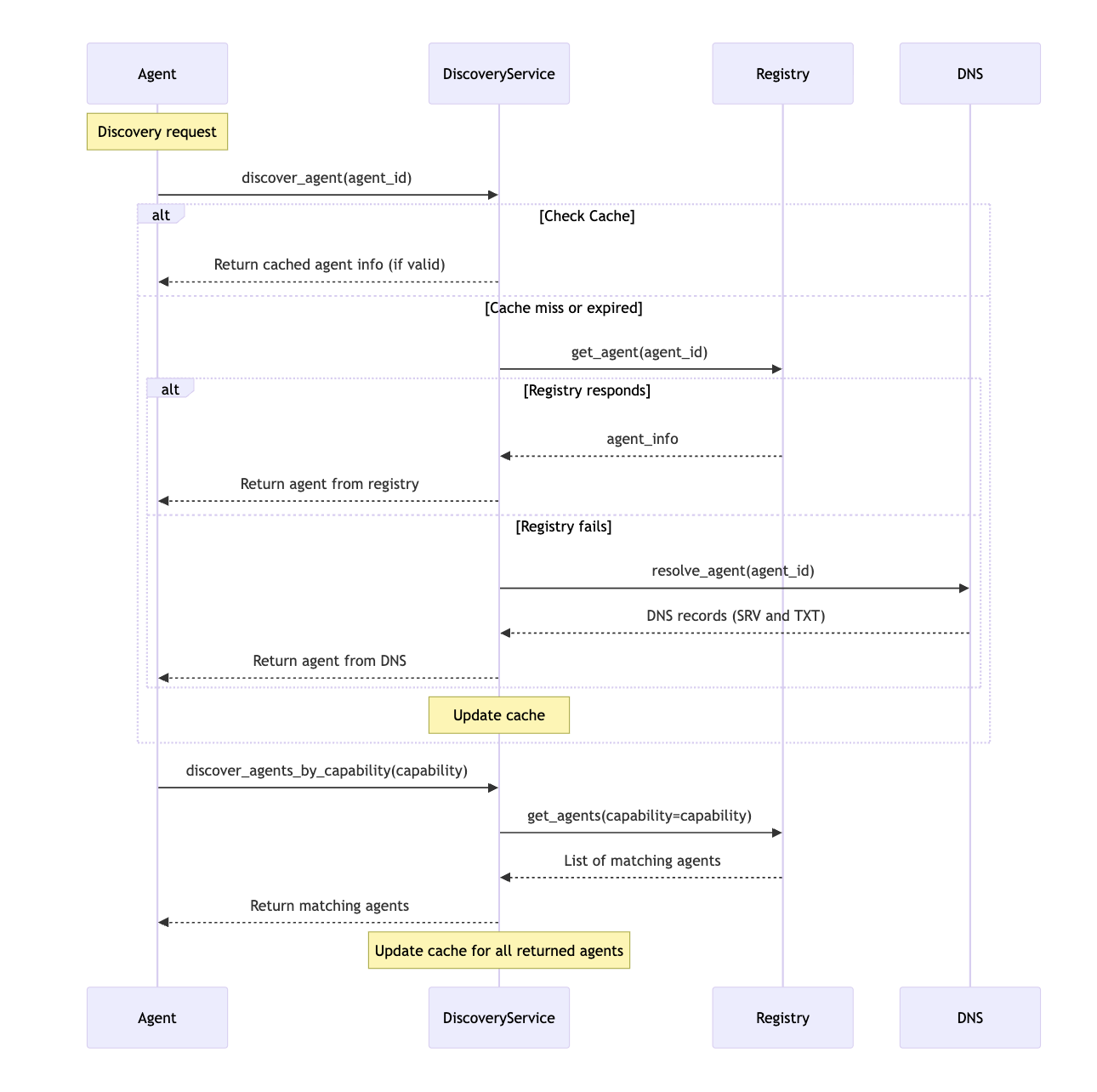 The Discovery Service component provides a unified way to discover other agents through multiple methods: