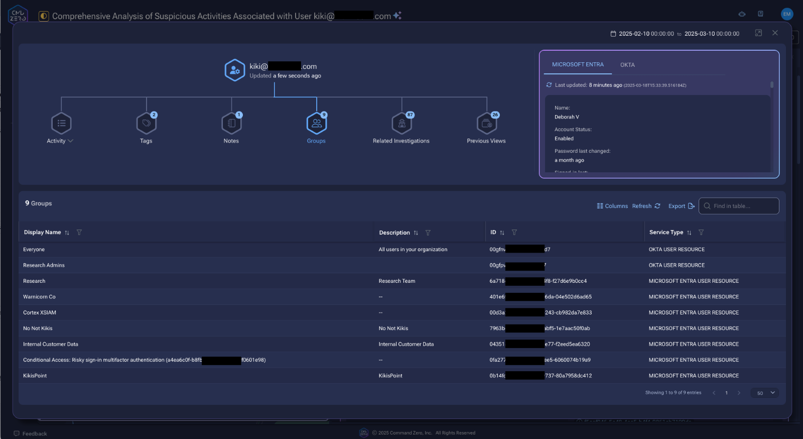 Command Zero automatically correlates identities across systems, eliminating manual directory lookups. The resource view also shows notes, tags about each user along with previous investigations that the user was involved with. An analyst investigating a potentially compromised Microsoft Entra account can instantly see the corresponding identities in Okta, GitHub, and other connected systems, along with the historical context for this lead.