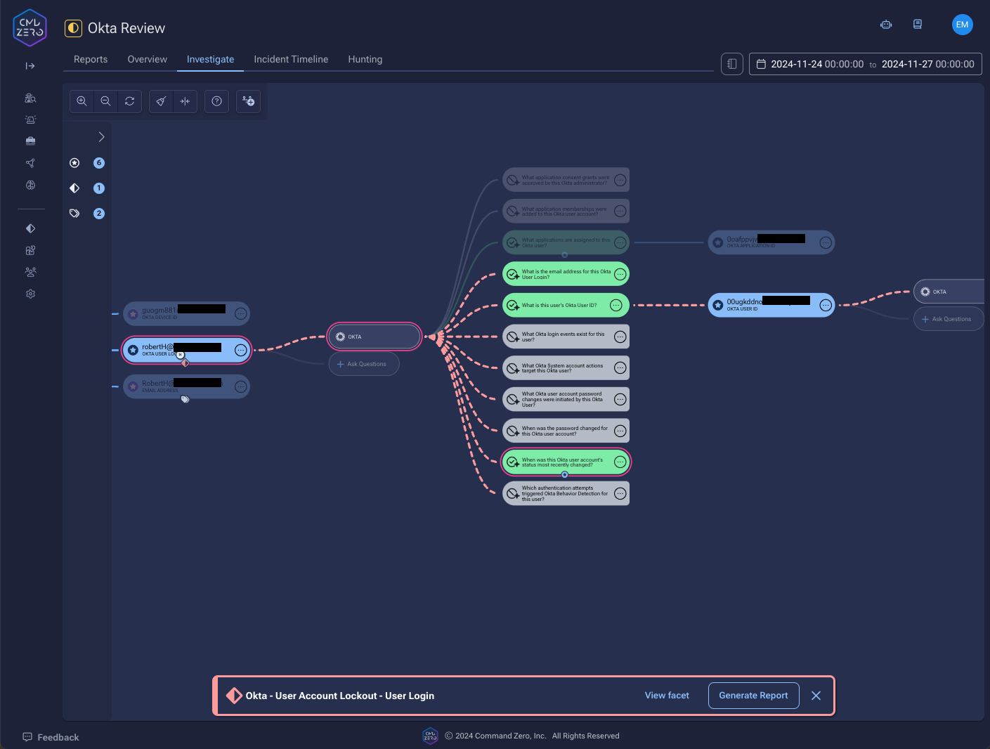 Other frequently used facets include a user’s last day, suspicious login activity, impossible travel and account compromise. The Command Zero security research team ship new facets every week.