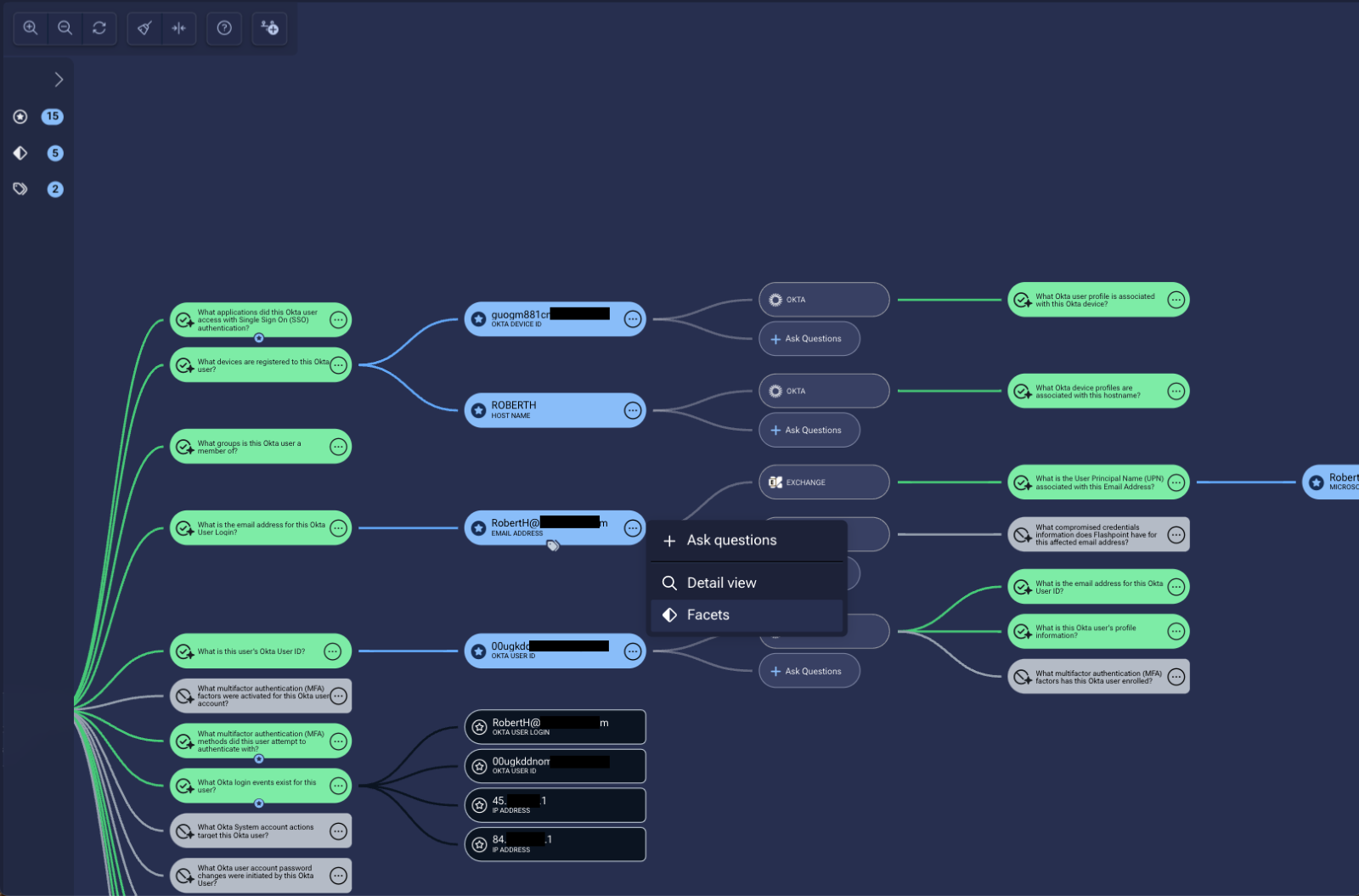 Facets are sequences of questions that get the data needed to deliver specific investigation outcomes. For example, in an investigation where you are validating the hypothesis: “We are receiving password spray attacks from this IP”, you can run the Okta or Entra Password Spray facet.