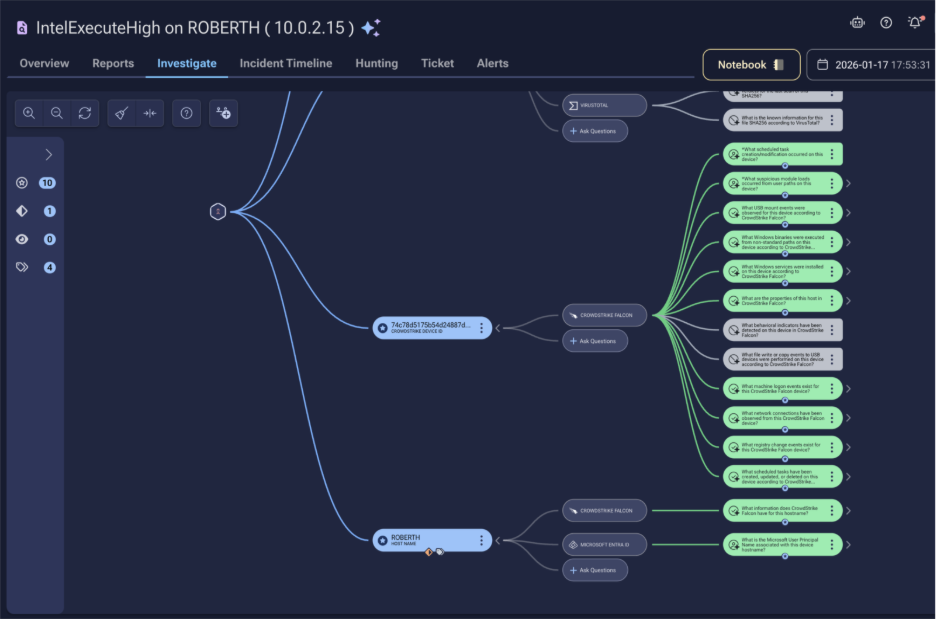 These customizations aren’t buried in configuration files or separated from the investigation execution. They become part of the transparent investigation plan and visible investigation flow. When an analyst views an investigation that used customized logic, they see exactly what organization-specific intelligence was applied. The custom questions appear alongside the generic baseline. The custom data sources are queried and displayed in the investigation flow. The institutional knowledge becomes part of the auditable investigation process.