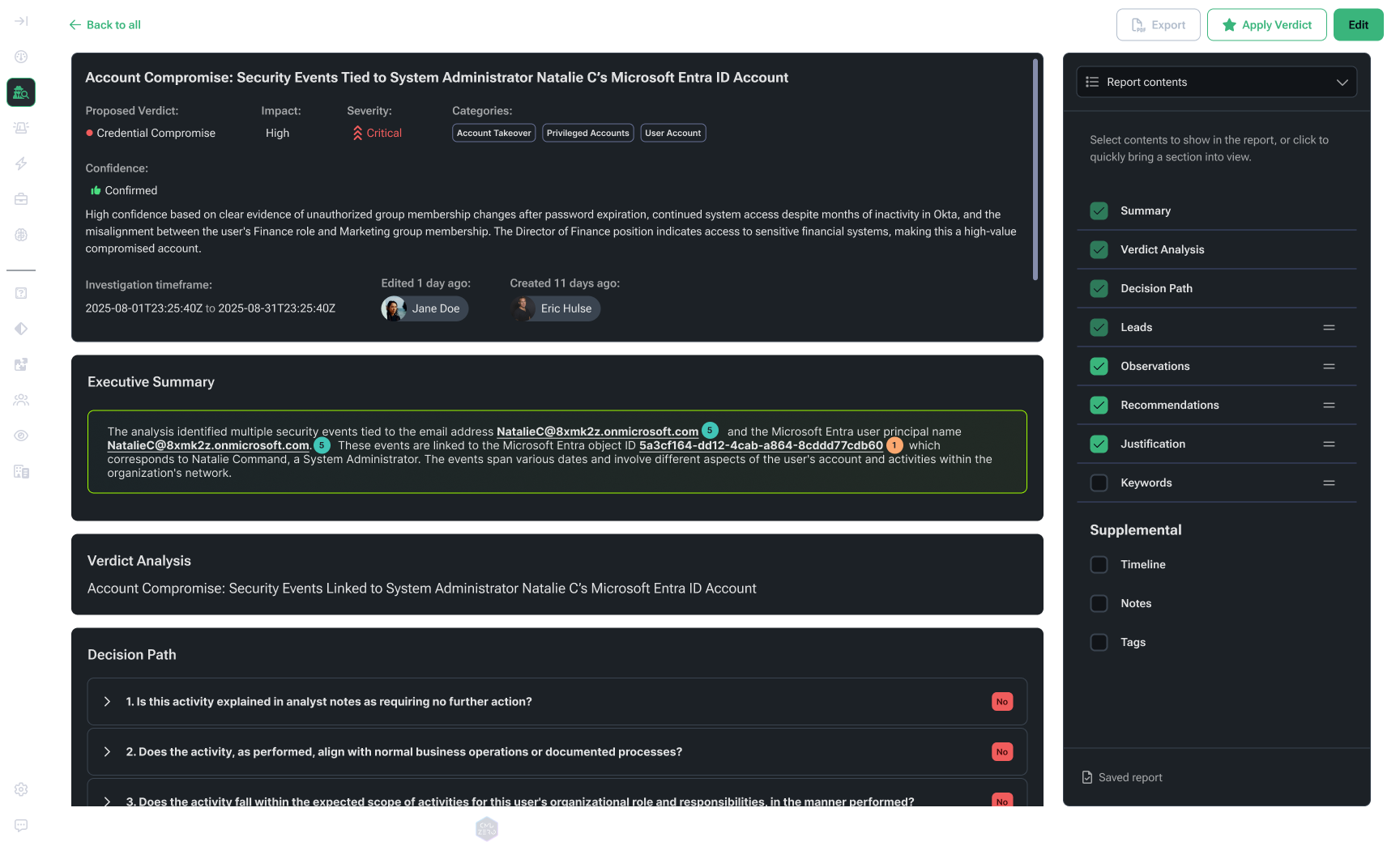 When an investigation closes, Command Zero generates a complete report automatically. No manual write-up. No timeline reconstruction.