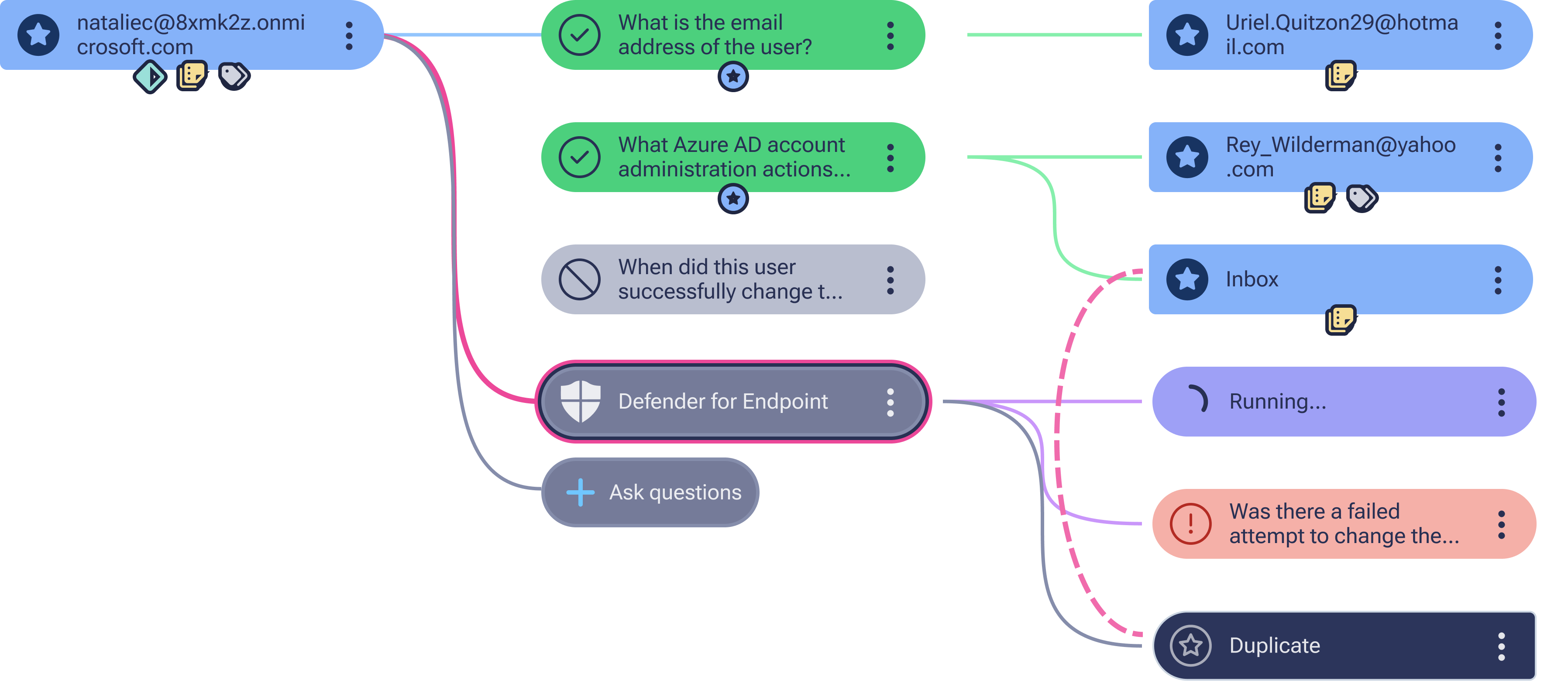 Whether an agent runs an investigation or a human analyst does, they use the same questions. Every step is visible, auditable, and reproducible.